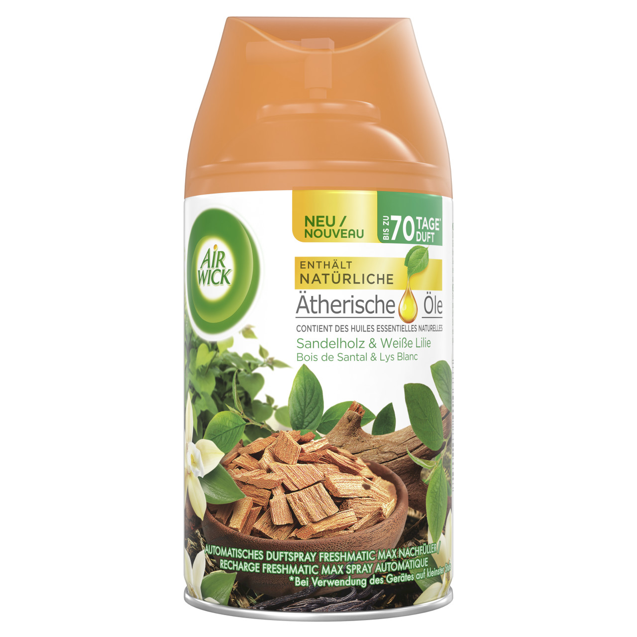 Air Wick Freshmatic Max Nachfüller Sandelholz & Weiße Lilie – Entdecken Sie diese charmante Duftkomposition aus warmem Sandelholz und der blumigen Frische von edler, weißer Lilie.